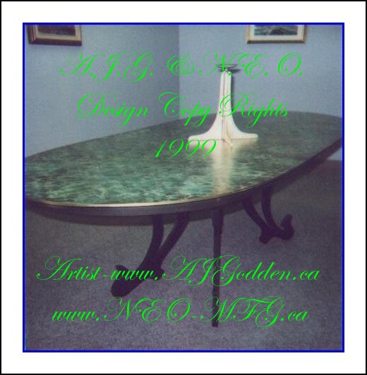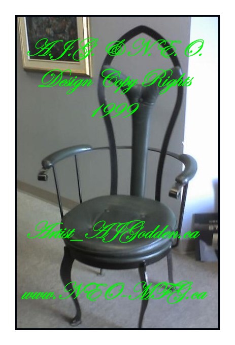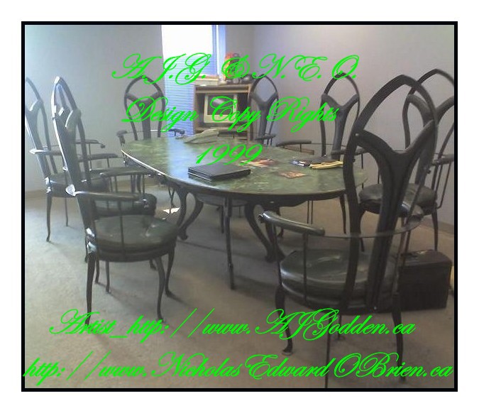These pictures below show Alec's designs for the conference room, first a 3/8" patina finished bronze plate table, with oxy flame cut 1-1/4" custom designed legs. Next are 8 medievil high back styled, green leather upholstered chairs, all custom made to Bruce's own specifications, and situated in the AJ memorial room at head office of Charles Jones Industrial Ontario..